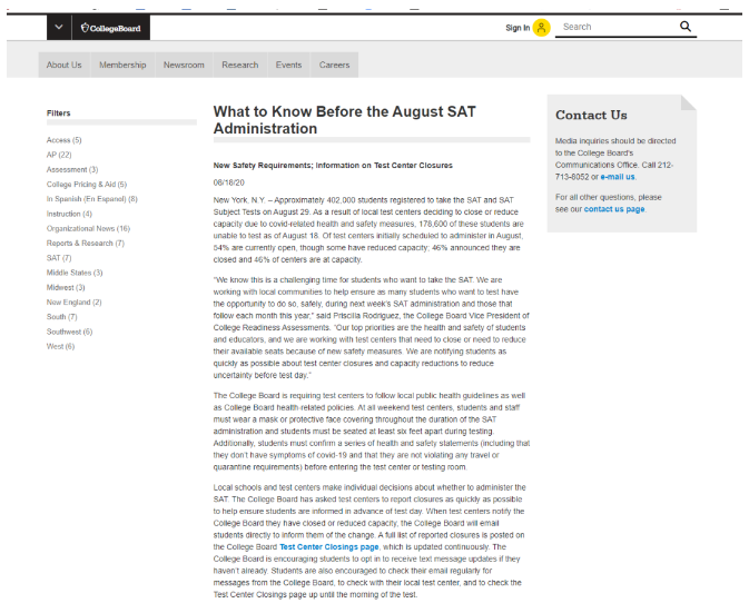 而通过CB的公告来看,被取消考试的学生远不止中国学生,一大批美国学生也面临着同样的问题。例如,为了防控疫情, 超过60个佛罗里达考试中心取消了8月29日的考试 。