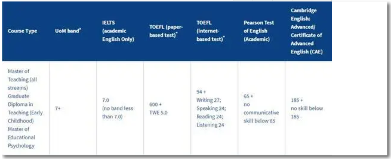 和其他高校一样,Teaching专业要求略高一些。要求雅思总分不低于7.0且各单项不低于7.0。
