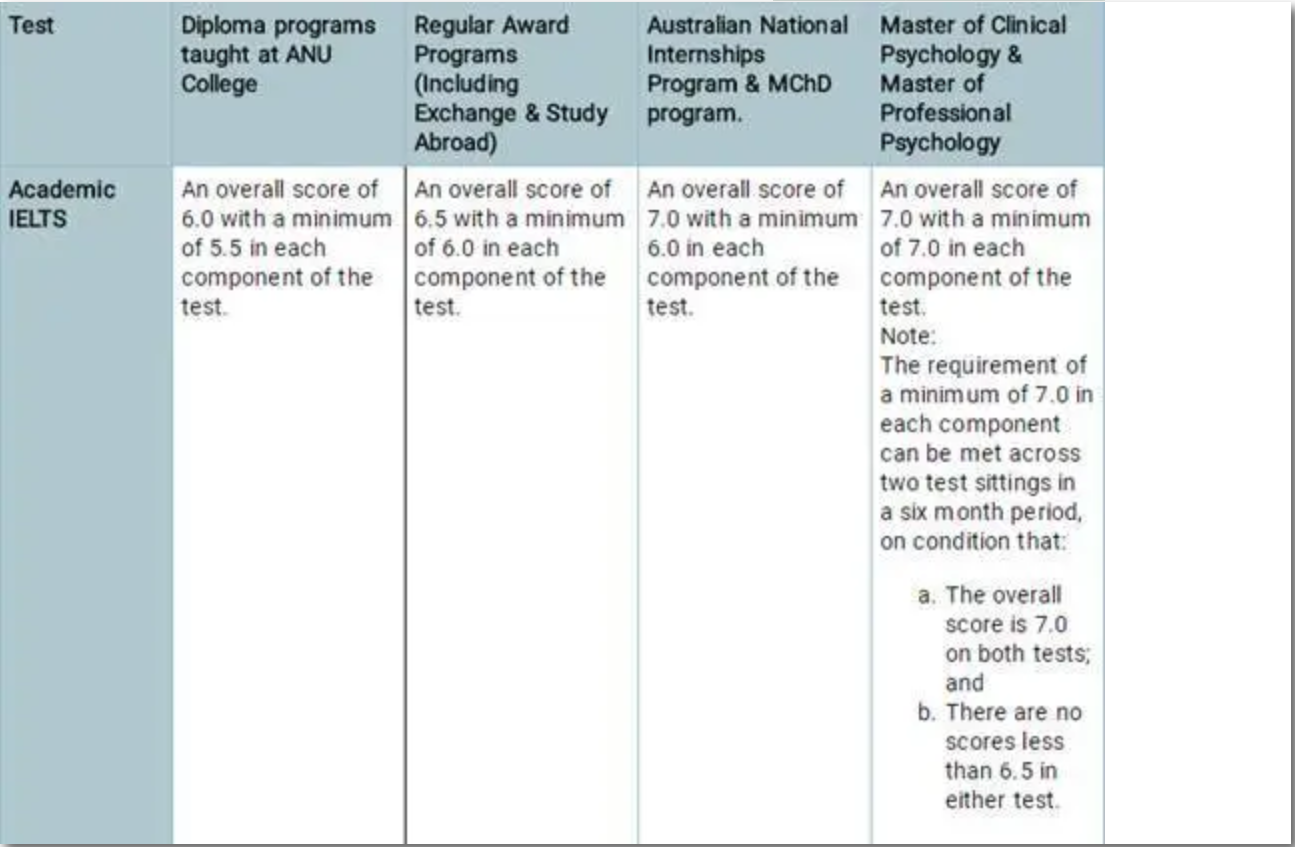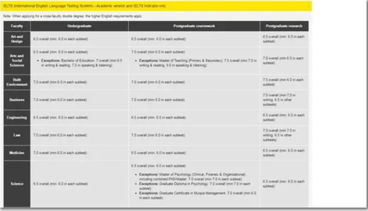 大部分澳洲院校申请对雅思成绩的要求,大致是一致的,要求如下: