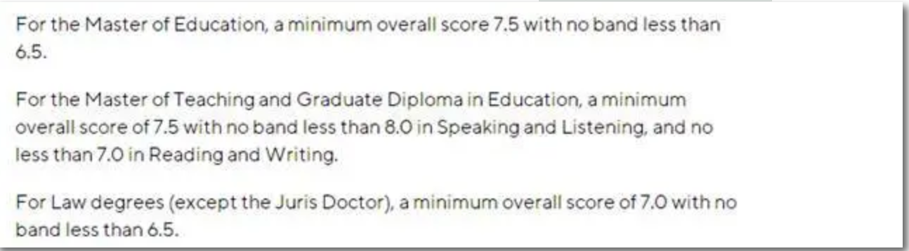 Teaching专业要求和悉尼大学不相上下。要求总分不低于7.5,各单项情况:听力和口语不低于8.0,写作及阅读不低于7.0。