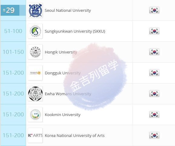 由上图可以看出来,韩国最好的设计是韩国排名第一,世界排名 29 位的 首尔国立大学 ,第二名则是著名韩剧《成均馆绯闻》里出现的 成均馆大学 (世界排名前 100 ),第三名是当代韩国年轻人火热的聚集地 弘益大学 (世界排名前 150 ),后面依次是 东国大学 、 梨花女子大学 、 国民大学 和 韩国艺术综合大学 。