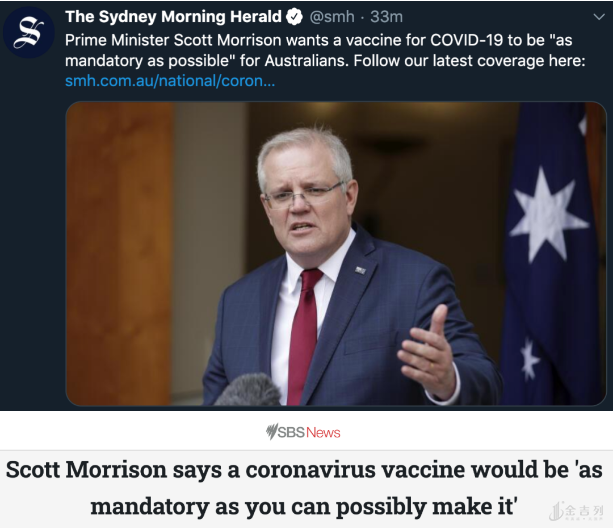 联邦政府已达成了一项重大的新冠病毒疫苗交易,获得了牛津大学(Oxfor University)正在生产的一种潜在疫苗的初步许可。在澳大利亚开始生产该疫苗之前,还需要该疫苗通过人体试验。莫里森表示,他对这种疫苗是安全有效的抱有“希望,但同时也很谨慎”,他预计该疫苗将于明年年初推出。他说:“我希望接种疫苗尽可能成为强制性的。”根据这项协议,澳大利亚将生产和供应疫苗——如果它被证明是安全和有效的——并免费提供给所有澳大利亚人。
