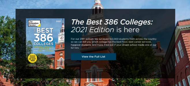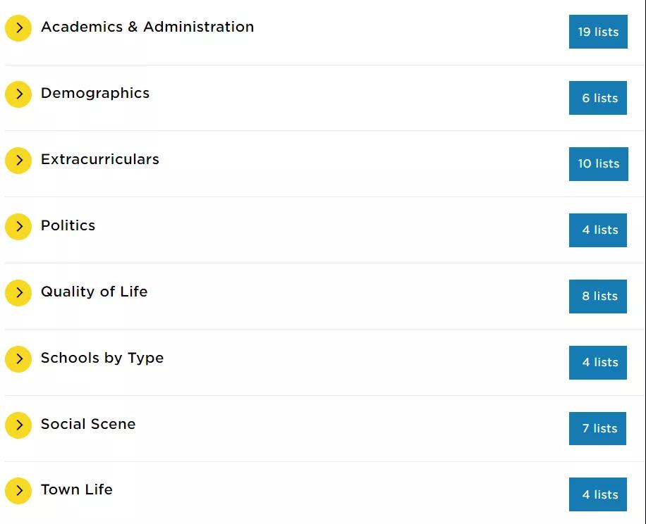 《普林斯顿评论》 不同于USnews在进行院校排名时更为注重学校学术声誉等,更关注学生本身在校读书的体验和校园生活的真实感受,榜单排名更接近美国学生眼中的“最好大学”。因此《普林斯顿评论》每年推出的各项榜单也是准留学生们关注的“美国院校数据分析”之一。