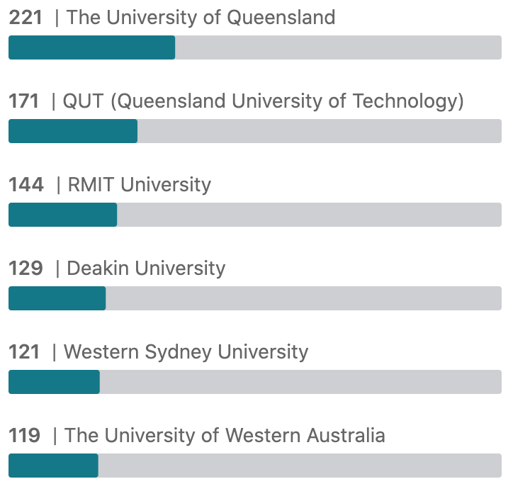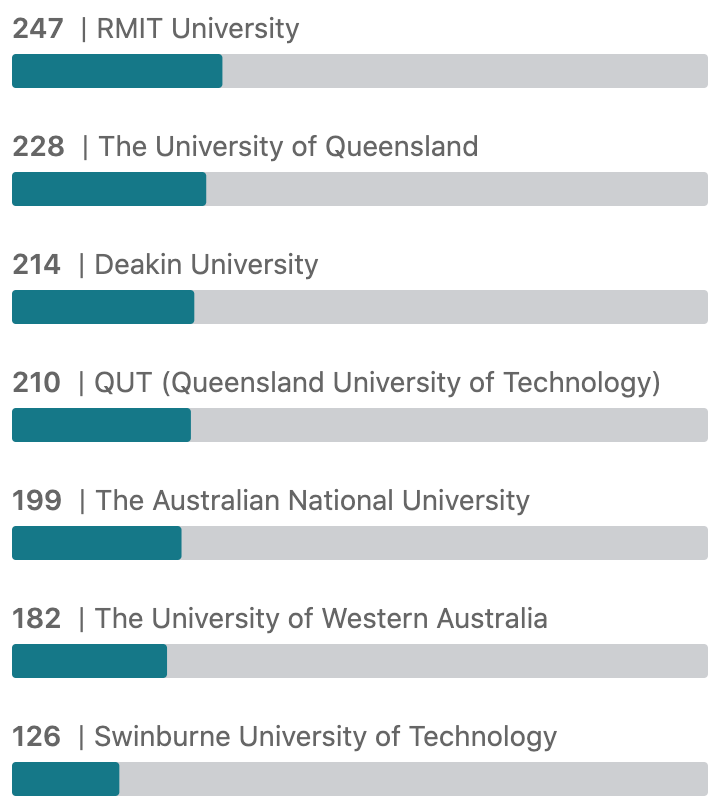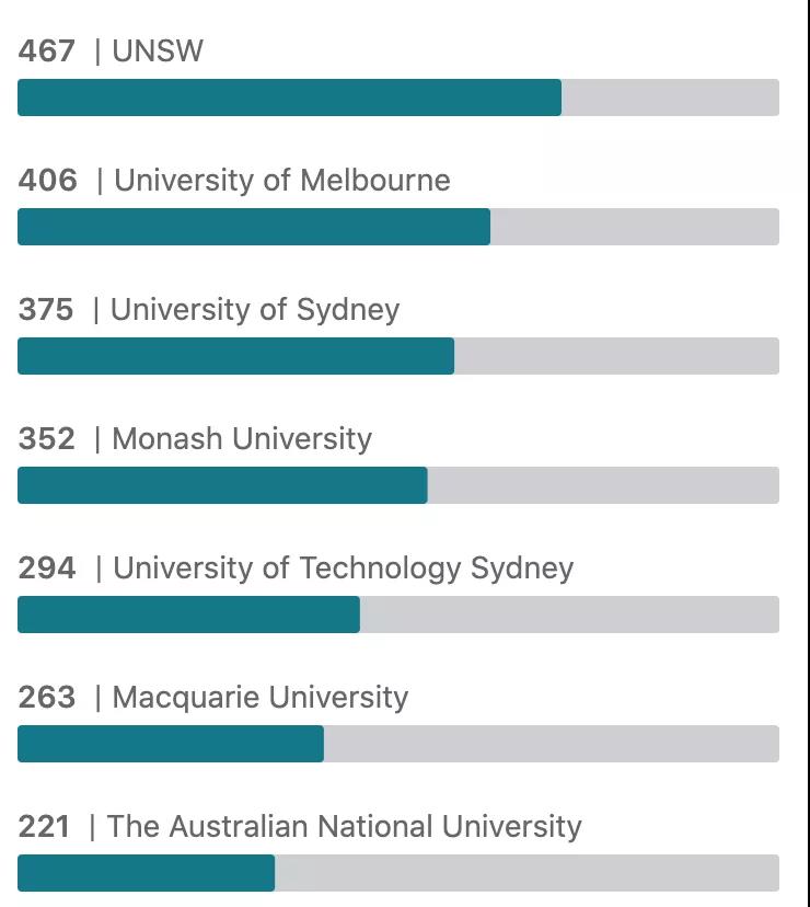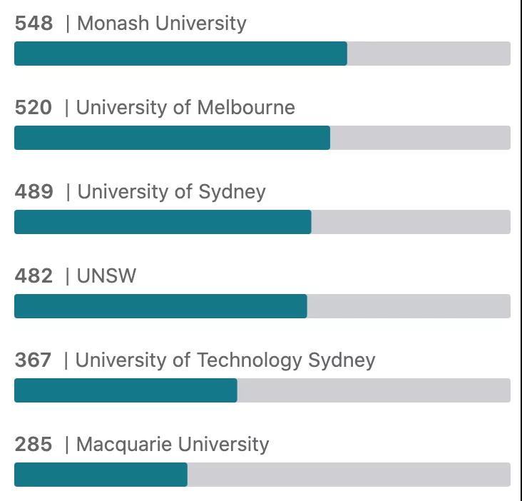 新南威尔士大学、墨尔本大学、悉尼大学、蒙纳士大学、澳洲国立大学、昆士兰大学、悉尼科技大学、麦考瑞大学、QUT、RMIT和迪肯大学等一众院校。