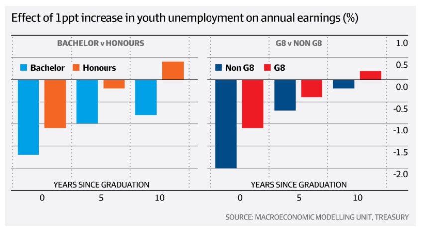 此外,根据澳洲联邦财政部的数据统计,澳洲八大名校毕业生、荣誉学位(Honours Degree)获得者或高学历的毕业生,通常比其它院校的毕业生或者没有更高学历的毕业生收入更高,工作更稳定。当年轻雇员失业率上升时,名校和高学历毕业生自带光环,收入减少幅度小于其他毕业生:澳洲八大名校的毕业生收入会受到1%的冲击,而非八大的毕业生的收入受到的冲击是2%。