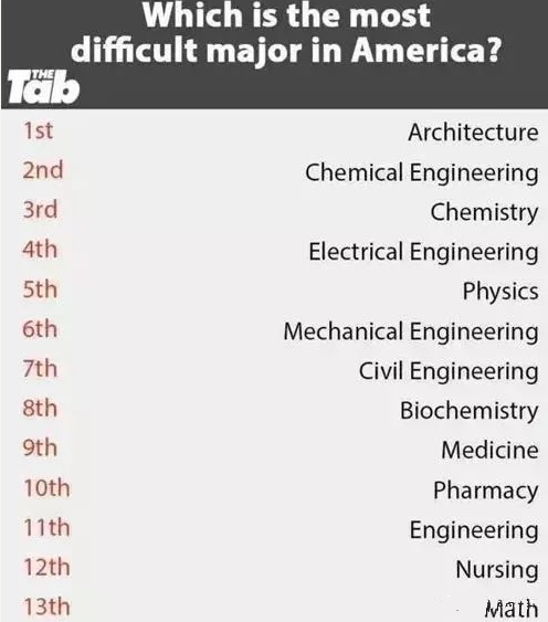 据报道, THE Tab 主要根据美国大学各个专业的学习时长、通宵熬夜程度、午睡时间、 GPA 以及学生感到的压力程度等几个因素进行综合评估,最终得出美国大学各个专业难易学习程度排名。 准备选专业的同学们,眼睛要擦亮啦 ~