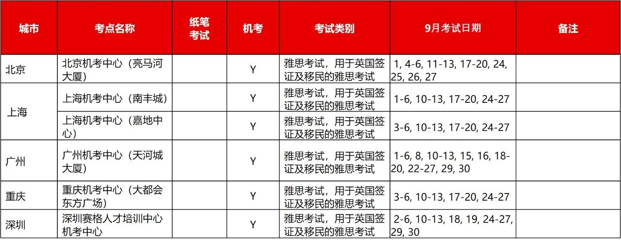9月在原有4个纸笔考试日期(9月5日,12日,17日和26日)基础上,新增9月3日,20日和27日 3个纸笔考试日期。同时,在北京、上海、广州、深圳和重庆的雅思机考中心在全月的多个考试日期提供场次众多的雅思考试和用于英国签证及移民的雅思考试机考服务。