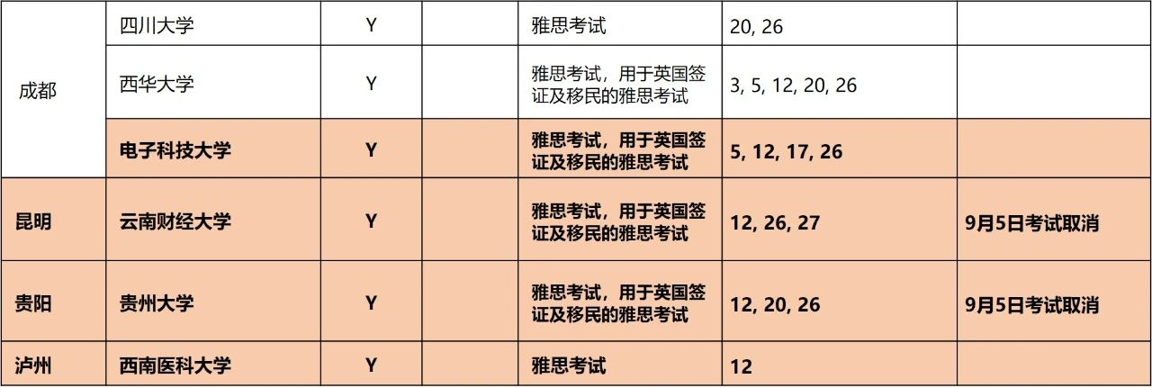 ① 电子科技大学考点新增9月12日,17日和26日用于英国签证及移民的雅思(IELTS for UKVI)纸笔考试。