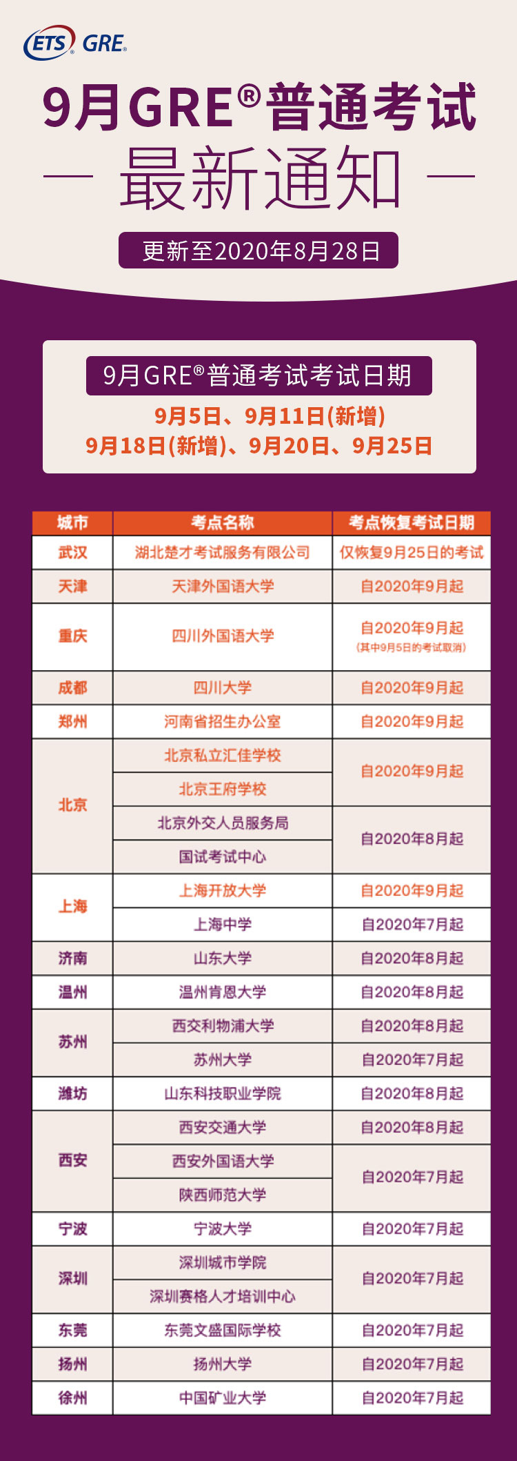 GRE普通考试确认于 9 月新增 2 个考试日期(共 5 个)、再恢复武汉、天津、重庆、成都、郑州、北京、上海 7个城市,8个考点(大陆地区共计 25 个考点),具体考期考点情况详见下图。