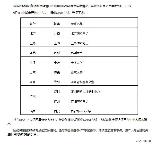 其它GMAT考点仍不具备组考条件,继续取消其9月份的GMAT考试,考试费将全额退还至考生个人报名账户。