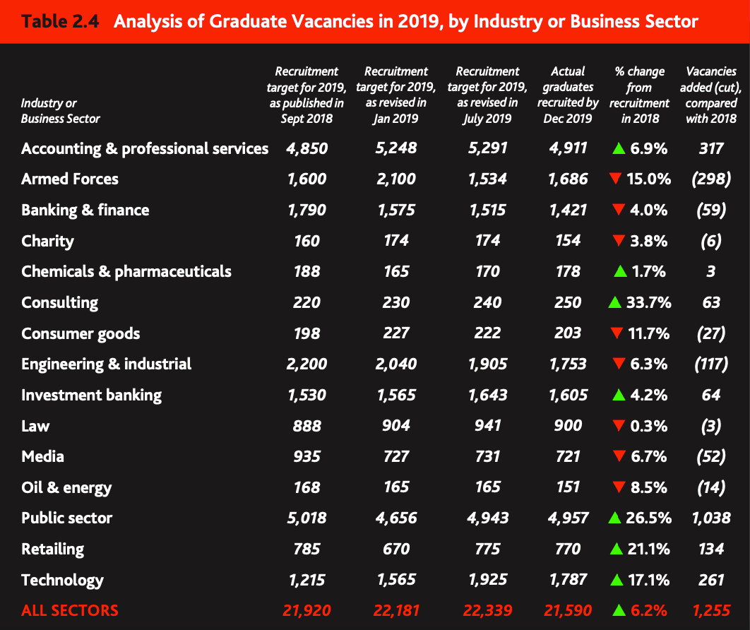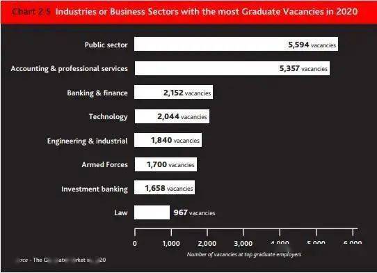 根据报告,2020年预计招聘最多的行业依次是公共部门、会计及专业服务、银行&金融、科技,以上行业将为毕业生提供15,000个岗位。