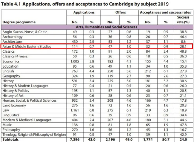 剑桥大学2019亚洲和中东研究录取数据