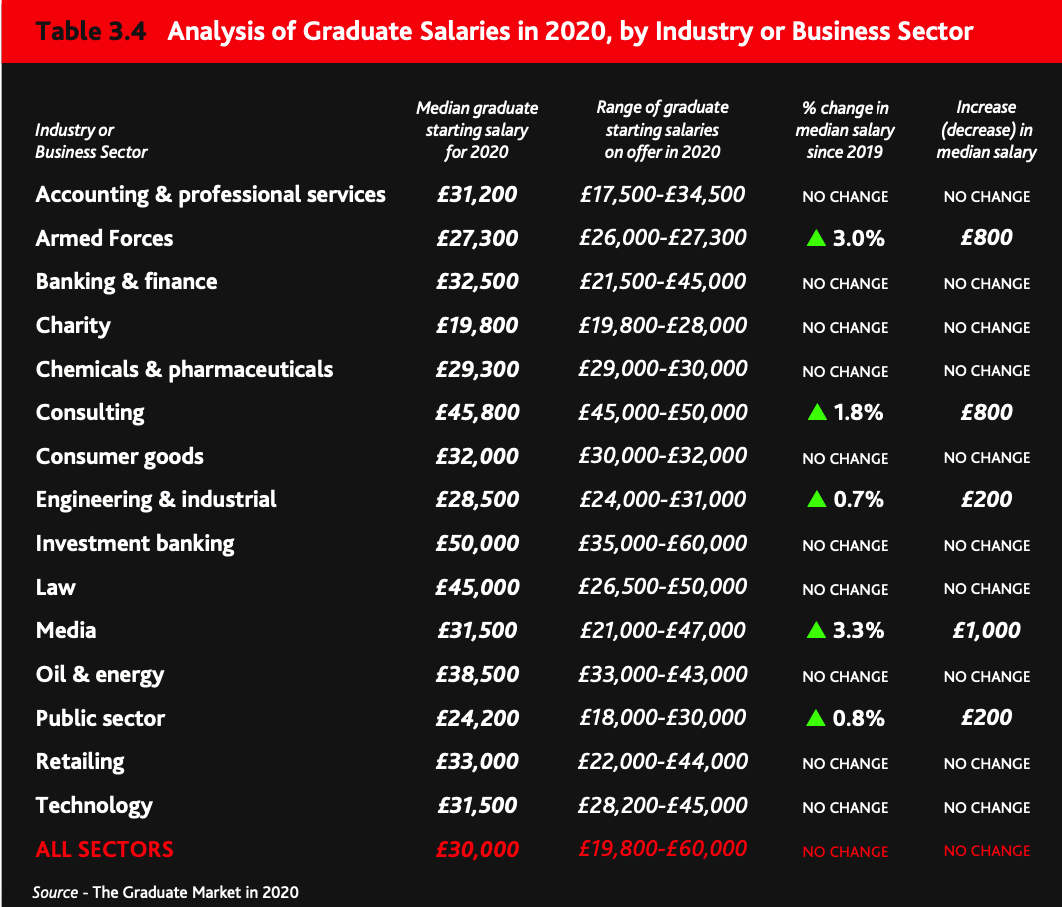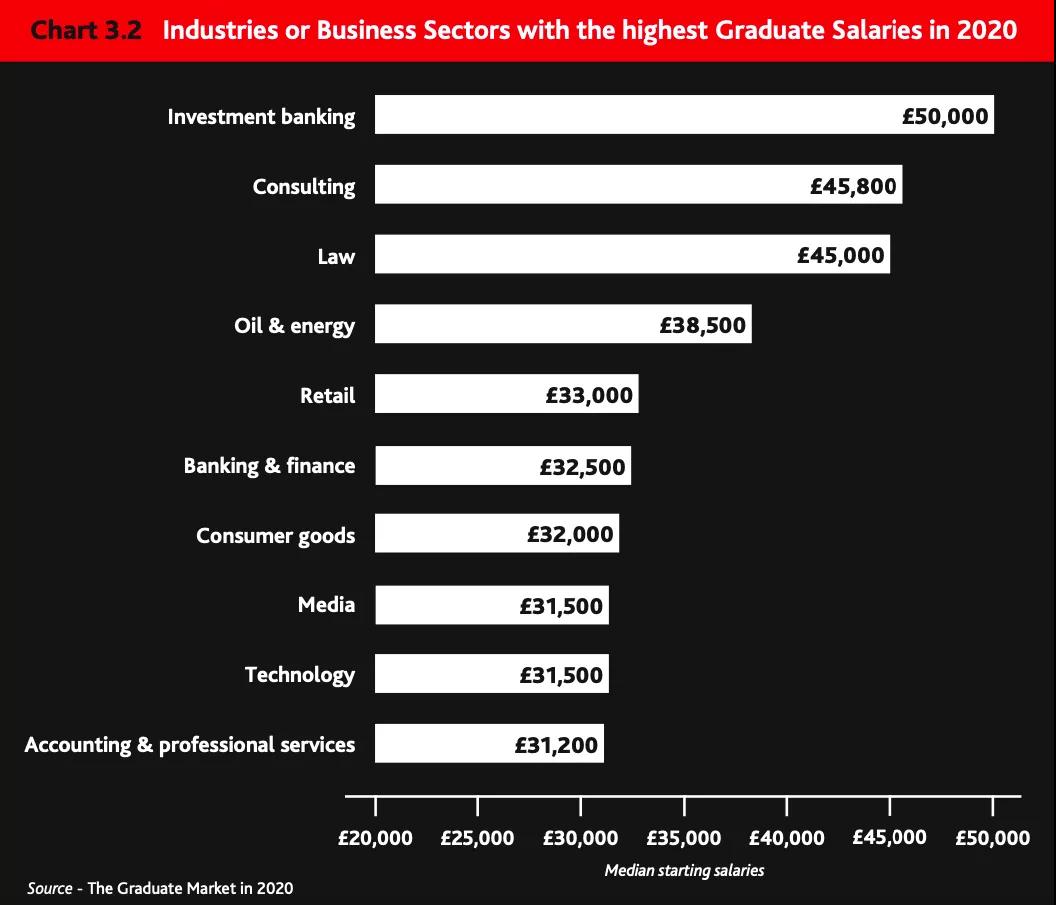 根据high fliers research的分析,2020英国毕业生起薪中值最高的前三名分别是投行、咨询和法律行业,起薪都在45,000英镑以上,对应届毕业生来说,薪酬最高的行业再次是投资银行业,高达50k;顶级战略咨询公司已将毕业生工资提高至45800英镑。