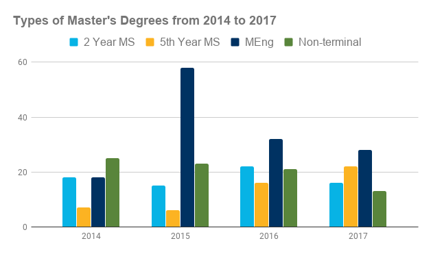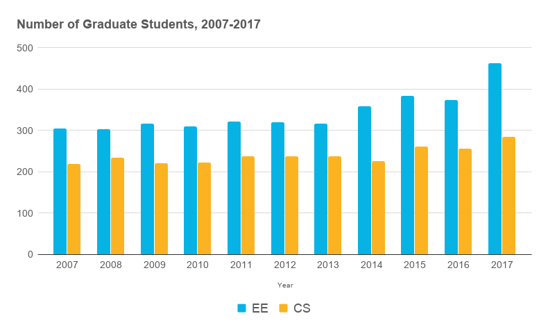 ① EE 电子电气工程和 CS 每年的 硕士 生几乎每年是越来越多, 2017 年人数达到了 747 人,其中 EE 462 个, CS 有 285 个,由此可看,如果申请计算机的竞争力比电子电气工程大很多,人数少了近 180 个;