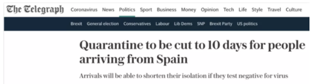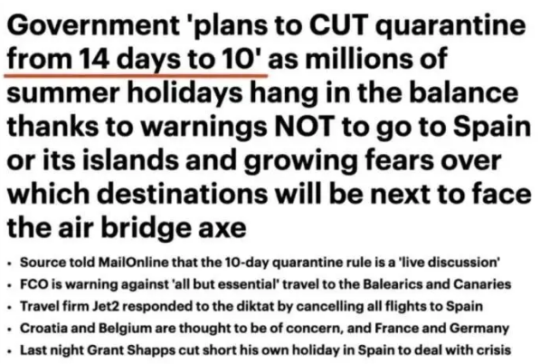 据《电讯报》报道,英国政府已宣布,把入境隔离时间从14天缩短至10天,只需要入境者在第8天接受检测时的结果为阴性即可。