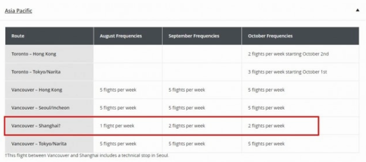 不过目前加拿大航空还没有公布何时开通北京直航班机的计划。查询加航官网,目前还没有多伦多直航北京的任何消息,加航官网公布的消息只有每周从温哥华往返上海一个航班,该航班9月起每周增加为两个航班。