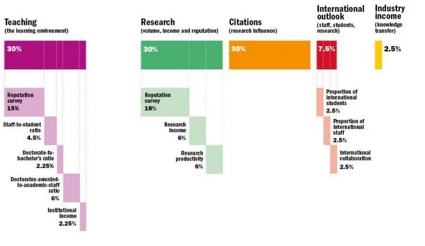 今年,共有来自世界93个国家和地区的超过1500所高校进入了泰晤士世界大学排名的榜单中,评判的绩效指标分为5个方面:教学(学习环境);研究(数量、收入和声誉);引文(研究影响力);国际展望(员工、学生和研究);行业收入(知识转移)。