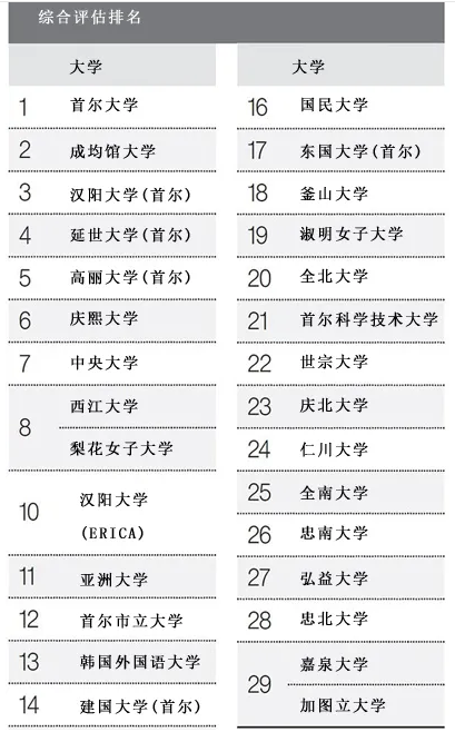 在“2019年中央日报大学评估”的综合评估排名中,首尔大学位列榜首。接下来依次是成均馆大学、汉阳大学(首尔校区)、延世大学(首尔校区)、高丽大学(首尔校区)。从2015年改变评估机制以来,首尔大学连续五年蝉联第一,成均馆大学等四所大学也连续五年占据排行榜前列。