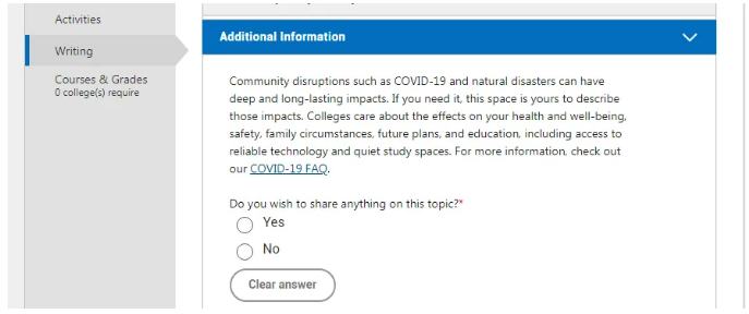 今年除了七选一的主文书之外,CA还增加了一篇关于疫情的选写文书。CA系统官方表示,希望减少受疫情影响的申请人的焦虑,并提供了学生与大学分享相关经历的机会。