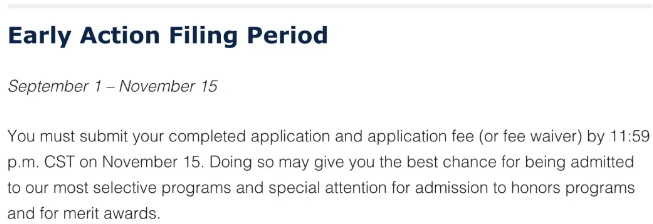 但在2020-2021申请季,UIUC将EA的截止日期调整为11月15日,比往年推迟了15天。且两轮申请结果将同时在2021年2月中旬公布。