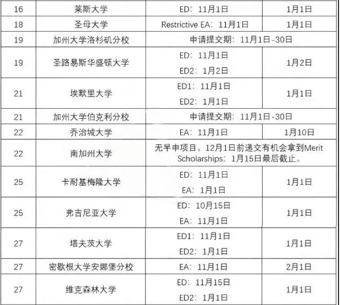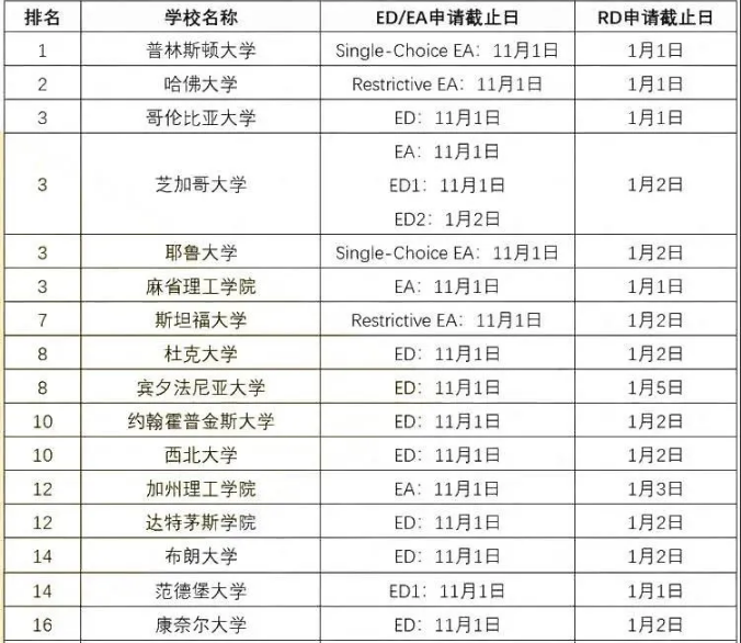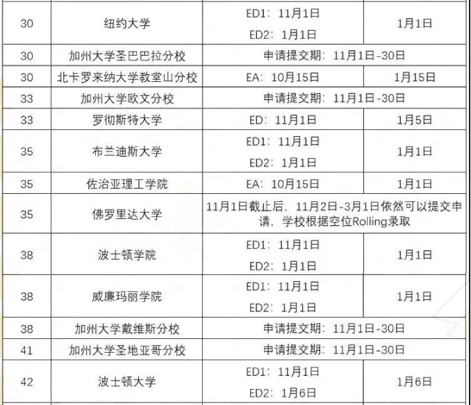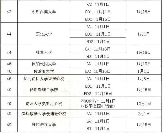以下为大家汇总了美国TOP50大学的秋季入学申请截止日,包含ED/EA/RD各个申请时间节点,方便大家在选校的时候参考。