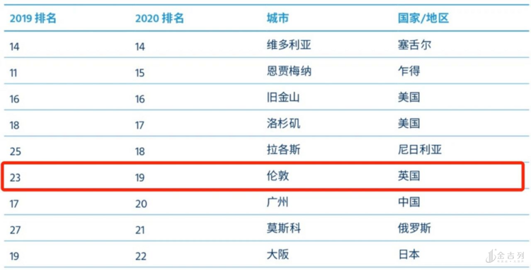 在Top10中,英国并没有城市上榜,伦敦仅位列第19位。