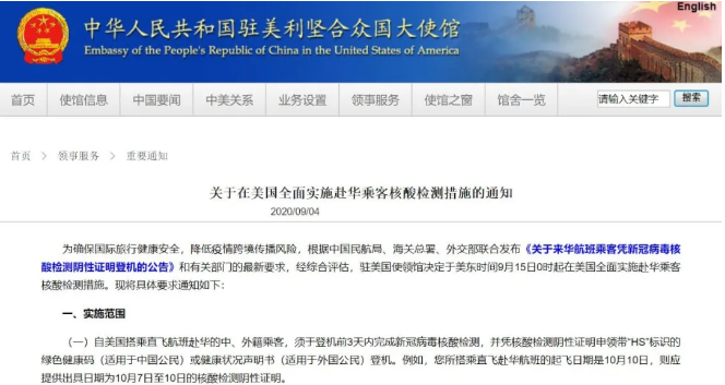 中国驻美大使馆9月4日发布《关于在美国全面实施赴华乘客核酸检测措施的通知》: