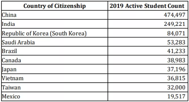 2019学年注册亚洲留学生共有1,137,419人(比上一年度下降2.4%),亚洲依然为留美学生第一生源地。