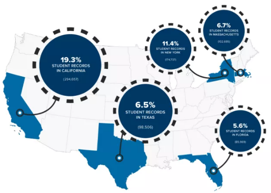 数据显示,国际学生在美国首选留学地区是加利福尼亚州(近20%留学生选择该州),紧随其后的还有纽约、马塞诸塞、德克萨斯和佛罗里达州。这几个州的注册国际人数和占比见下图: