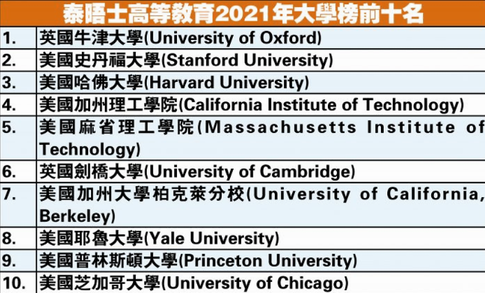 该排名榜前10名中(见附表),美国大学占8所,英国学府有两所,牛津大学连续第5年名列榜首。