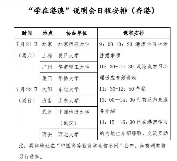 对于赴香港学习,你一定充满了欣喜和憧憬,但对于未来,可能也会感觉陌生、产生迷茫。为了帮助即将赴港学习的内地同学更好了解香港情况,顺利适应在港的学习和生活,教育部港澳台事务办公室将于7月21日—22日在北京、上海、广州、厦门、沈阳、济南、武汉、西安八地举办“2018学在港澳”说明会。说明会将围绕赴港学生最关心的内容展开,包括在港学习生活注意事项、赴港学习心理适应、行前及学成归来相关政策和规定等。以下是关于说明会的各个行程安排。有需要的同学提前报名,准时参加呀!