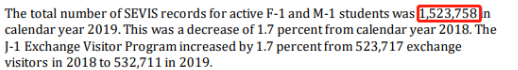 2019报告指出,年度有效的F-1和M-1学生的SEVIS记录总数是1,523,758人,其中F-1学生的数量是1,306,869名,这比2018年下降了1.7%。此外,持有J-1交流访问者签证的人数为532,711,比2018年增加了1.7%。
