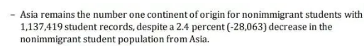 除南极洲之外,美国留学生来自超过323个国家和地区。目前有1,137,419名亚洲留学生记录在案,仍是留学生第一生源地,不过值得注意的是这一数据比2018年下降了2.4%。