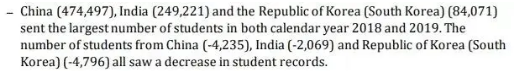 中国、印度、韩国依次为留学生最多的国家,其中来自中国的留学生474,497名、印度留学生249,221名和韩国留学生84,071名。