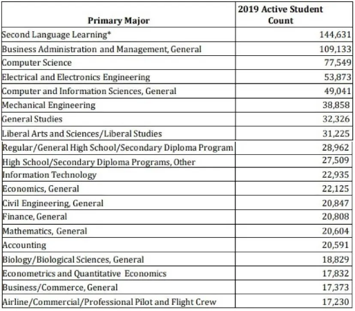2019年,最受留学生喜爱的前五名专业为外语、工商管理、计算机科学、电气和电子工程、以及计算机和信息科学。