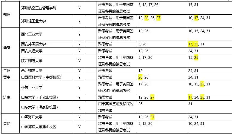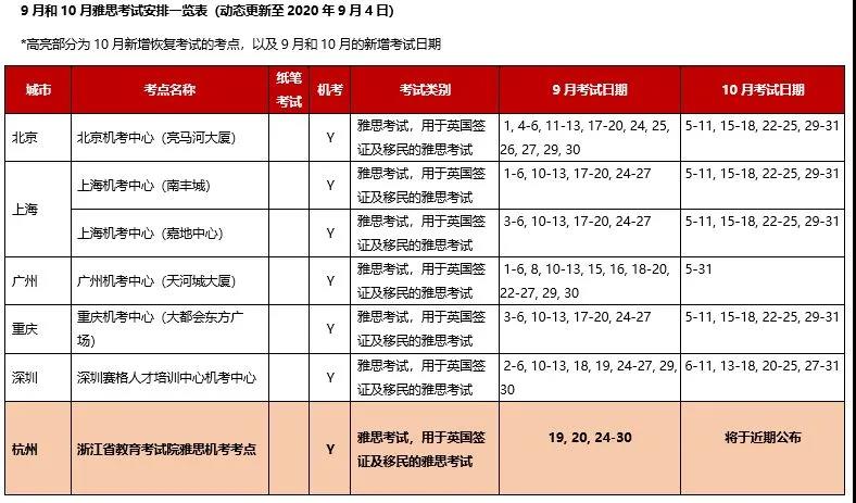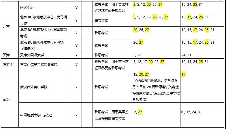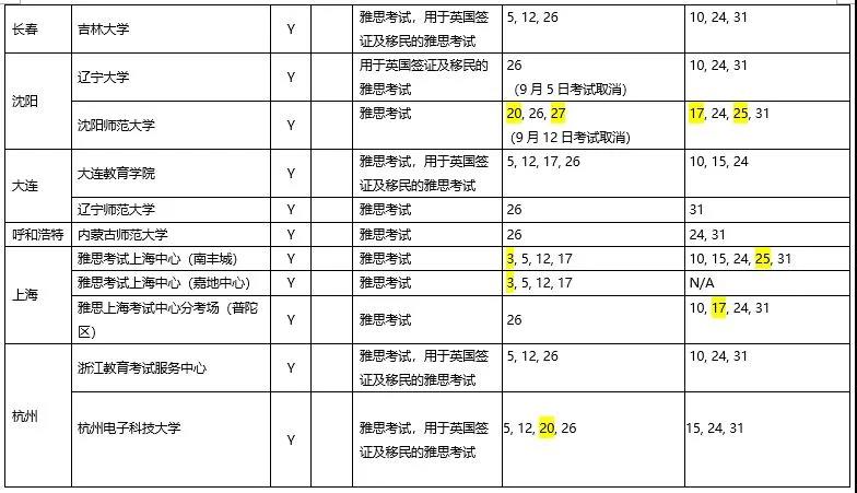 以下是9月全国各地考点的雅思考试安排汇总表: