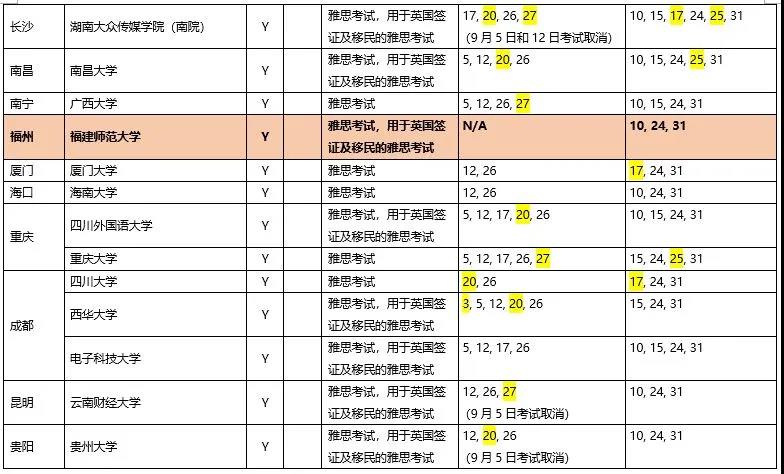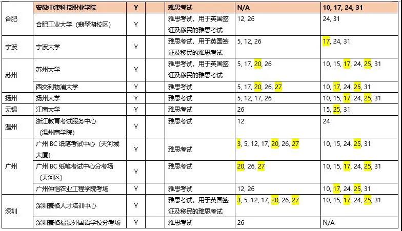 三、 10月新增福建师范大学(福州)、安徽中澳科技职业学院(合肥)纸笔考点恢复考试。截至目前,10月共有35个城市的57个考点恢复雅思和用于英国签证及移民的雅思(IELTS for UKVI)纸笔考试和机考。