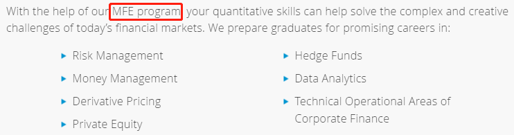 这些学校mfe项目不仅实力不俗,在quantnet排名中也名列前茅,还拥有 强大的校友网络和稳定的人才输出, 属于当之无愧的target school。