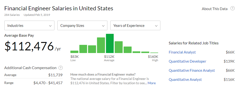 据求职网站glassoor统计,financial engineer(mfe的对口岗位)的平均起薪为 $83k/年, 整个行业的平均薪资则高达 $112,476/年
