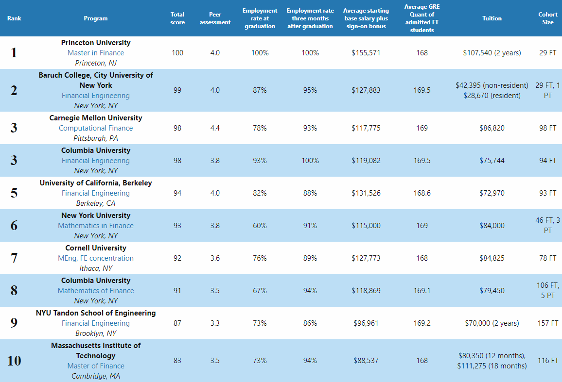 哥大的排名很值得说道,他们的金工专业分为financial engineering和mathematics of finance两个项目。