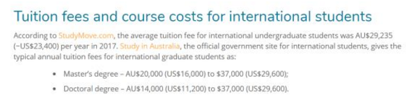 与其他英语国家相比,澳大利亚学费更加合理。根据最新统计,国际学生在澳洲接受高等教育一年的学费大概在2.9万澳币左右(相当于人民币14.5万元,以汇率1澳币=5.0人民币计算)。