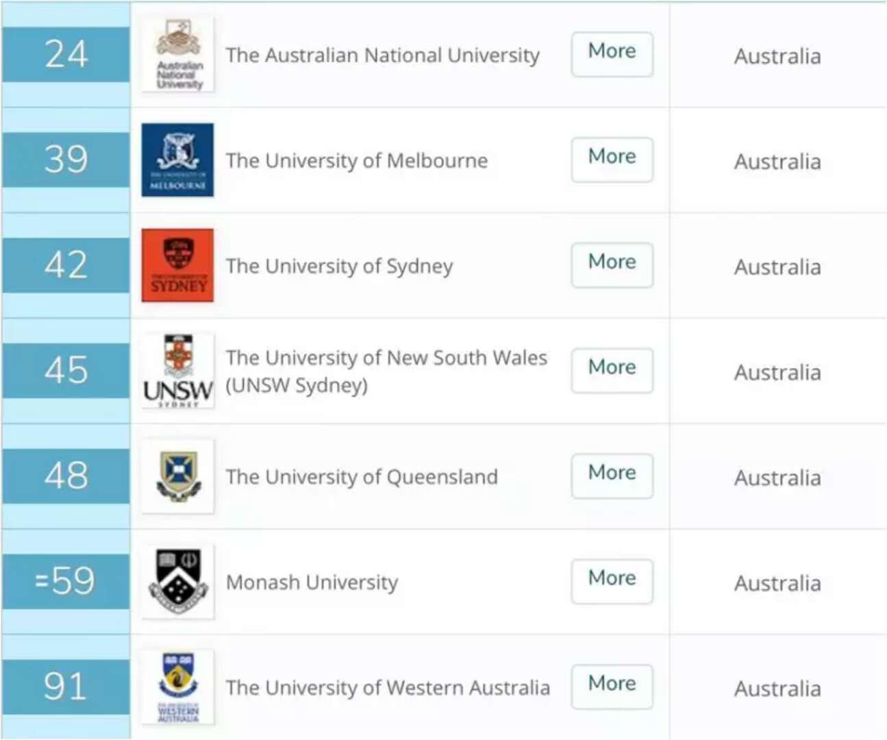 相对于 2017-2018 年的成绩,澳大利亚今年的 Top 100 大学在保证数量的基础上,排名普遍有小幅度提升。其中悉尼大学上升 8 名,墨尔本大学、悉尼大学、莫纳什大学和西澳大学均有 1-2 名的进步。