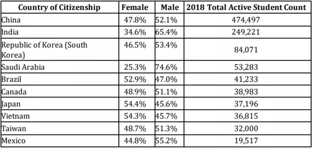 报告指出,年度有效的F-1和M-1学生的SEVIS记录总数是1,523,758人,除南极洲之外,有来自超过323个国家和地区,且有1,137,419名留学生来自亚洲,而中国为留学生最多的国家有 474,497 名。