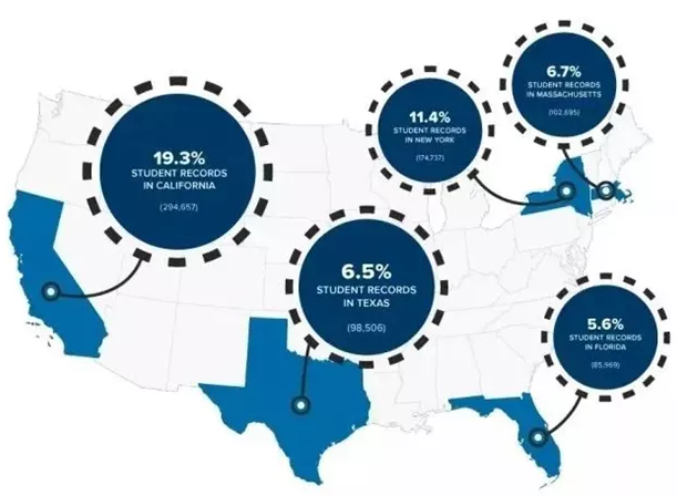 数据显示,2019年,在美国所有的州中,加州接收了最多的留学生,共计294,657名,占赴美留学总人数的 19.3% 。
