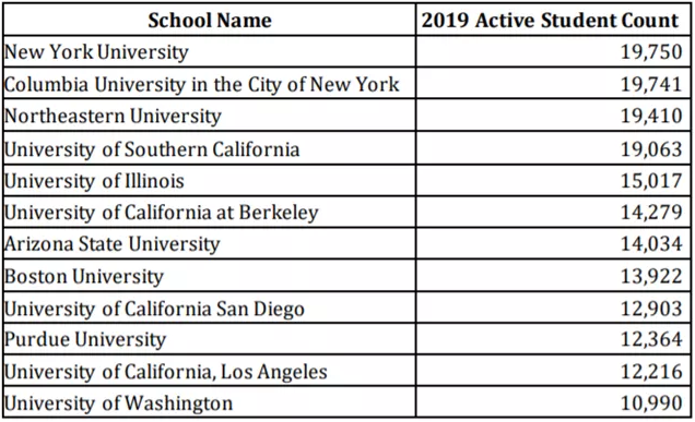 根据统计,NYU和哥大分别招收了数量最多的F1留学生,分别为19,750名和19,741名。