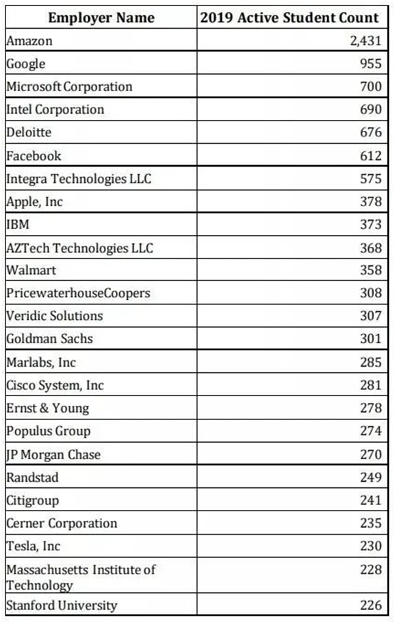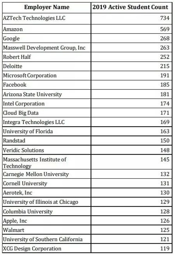 在2019年,获得OPT工作许可的学生有140,137名,获得STEM OPT工作许可的学生有72,168名,前25名的雇主数据如下: