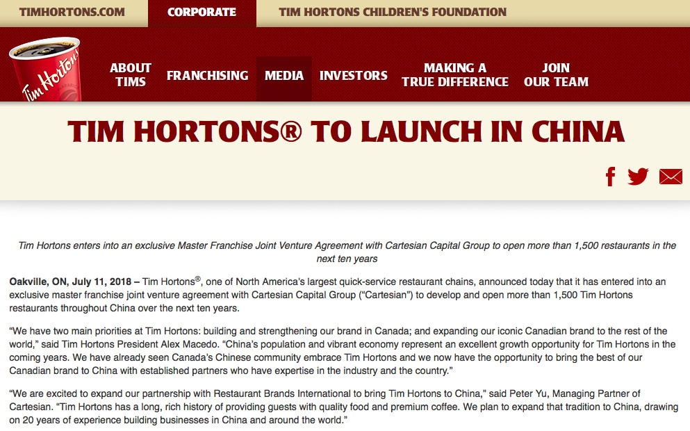 爆炸新闻&nash;加拿大国民咖啡Tim Hortons进军中国