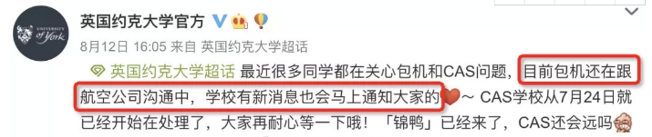 约克大学官方表示,目前包机还在跟航空公司沟通中,学校有新消息也会马上发布通知。官方还说,CAS学校从7月24日就已经开始在处理了,同学们再耐心等等。