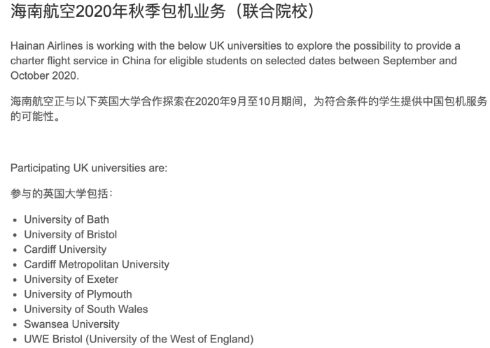 英国西南部的多所大学正在与海南航空合作,探索为学生提供包机的可能性,并陆续发布了包机服务可能性调查。