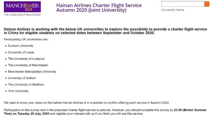 英格兰中北部的 9 所英国大学,也正和海南航空协商在 9 月和 10 月提供包机的可能性,利兹大学和约克大学就在这批学校中。